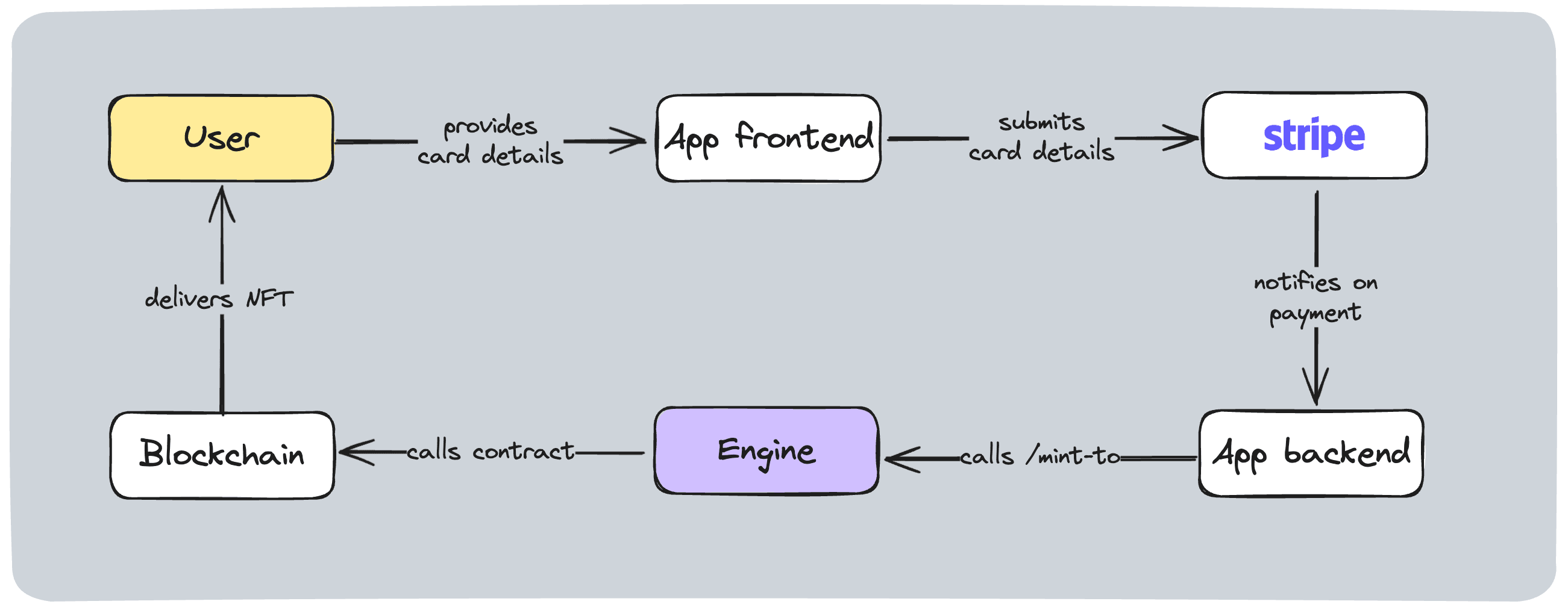 - the transactions API mints an NFT to the buyer's wallet.